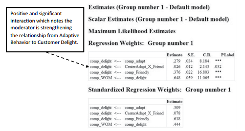 Let’s go to the “Estimates” link in the output. Notice that our interaction term is positive and significant (See Figure 7.5). This means that the relationship from Adaptive Behavior is being positively strengthened to Customer Delight by Friendliness. If the interaction was significant but negative, this would indicate that in the presence of the moderator, the relationship from Adaptive Behavior to Customer Delight is weakened. Our moderator has a significant direct relationship to Customer Delight; but even if it was non-significant, that is okay because we are really concerned only with the interaction to determine if moderation is present. If our inter- action term was non-significant, then we could say that there is evidence that the construct of Friendliness is not moderating the relationship from Adaptive Behavior to Customer Delight.