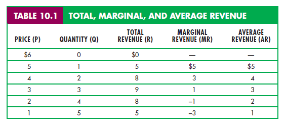 Table 10.1 shows the behavior of total, average, and marginal revenue for this demand curve. Note that revenue is zero when the price is $6: At that price, nothing is sold. At a price of $5, however, one unit is sold, so total (and