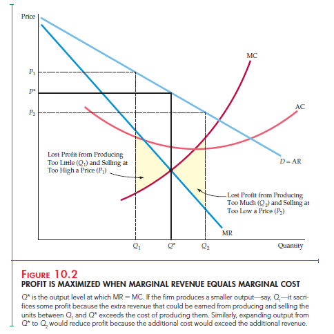In Figure 10.2, the larger quantity Q2 is likewise not profit maximizing. At this quantity, marginal cost exceeds marginal revenue. Therefore, if the monopolist produced a little less than Q2, it would increase its total profit (by MC – MR). It could increase its profit even more by reducing output all the way to Q*. The increased profit achieved by producing Q* instead of Q2 is given by the area below the MC curve and above the MR curve, between Q* and Q2.