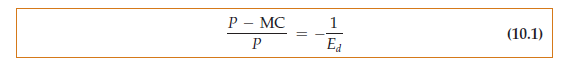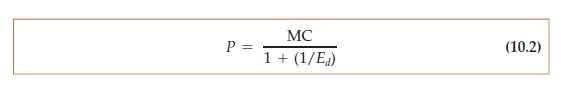 How does the price set by a monopolist compare with the price under compe- tition? In Chapter 8, we saw that in a perfectly competitive market, price equals marginal cost. A monopolist charges a price that exceeds marginal cost, but by an amount that depends inversely on the elasticity of demand. As the markup equation (10.1) shows, if demand is extremely elastic, Ed is a large negative number, and price will be very close to marginal cost. In that case, a monopolized market will