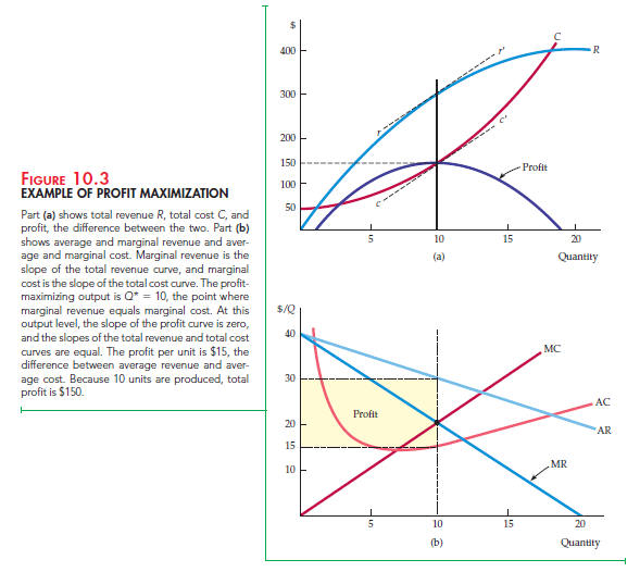 Figure 10.3(b) shows both the corresponding average and marginal revenue curves and average and marginal cost curves. Marginal revenue and marginal cost intersect at Q* = 10. At this quantity, average cost is $15 per unit and price is $30 per unit. Thus average profit is $30 – $15 = $15 per unit. Because 10 units are sold, profit is (10)($15) = $150, the area of the shaded rectangle.