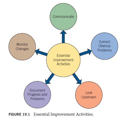 Continual improvement is not about solving isolated problems as they occur. Such an approach is viewed as “putting out fires” by advocates of total quality. Solving a problem without correcting the fault that caused it— in other words, simply putting out the fire—just means the problem will occur again. Quality expert Peter R. Scholtes and his colleagues recommend the following five activities, which he sees as crucial to continual improvement (see Figure 19.1):