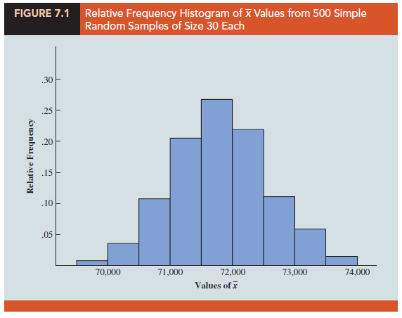 Let us return to Figure 7.1. We would need to enumerate every possible sample of 30 managers and compute each sample mean to completely determine the sampling distribution of X. However, the histogram of 500 X values gives an approximation of this sampling distribution. From the approximation we observe the bell-shaped appearance of the distribution. We note that the largest concentration of the X values and the mean of the 500 X values are near the population mean m = $71,800. We will describe the properties of the sampling distribution of X more fully in the next section.