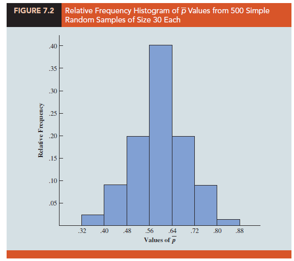 The 500 values of the sample proportion p are summarized by the relative frequency histogram in Figure 7.2. As in the case of X, p is a random variable. If every possible sample of size 30 were selected from the population and if a value of p were computed for each sample, the resulting probability distribution would be the sampling distribution of p. The relative frequency histogram of the 500 sample values in Figure 7.2 provides a general idea of the appearance of the sampling distribution of p.