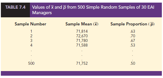 In the preceding section we said that the sample mean X is the point estimator of the population mean m, and the sample proportion p is the point estimator of the population proportion p. For the simple random sample of 30 EAI managers shown in Table 7.2, the point estimate of m is X = $71,814 and the point estimate of p is p = .63. Suppose we select another simple random sample of 30 EAI managers and obtain the following point estimates: