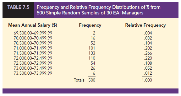 Now, suppose we repeat the process of selecting a simple random sample of 30 EAI managers over and over again, each time computing the values of X and p. Table 7.4 contains a portion of the results obtained for 500 simple random samples, and Table 7.5 shows the frequency and relative frequency distributions for the 500 X values. Figure 7.1 shows the relative frequency histogram for the X values.