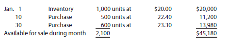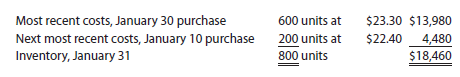 The physical count on January 31 shows that 800 units are on hand. Using the FIFO method, the cost of the merchandise on hand at the end of the period is made up of the most recent costs. The cost of the 800 units in the ending inventory on January 31 is determined as follows: