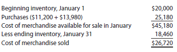 Deducting the cost of the January 31 inventory of $18,460 from the cost of merchandise available for sale of $45,180 yields the cost of merchandise sold of $26,720, as shown below.