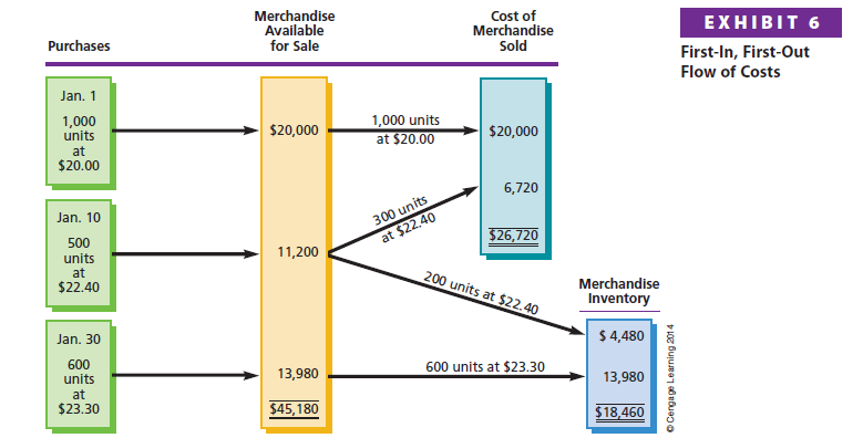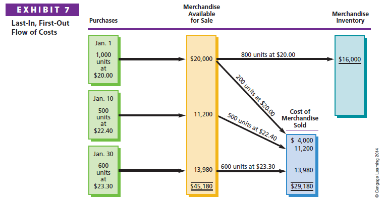 The $16,000 cost of the ending merchandise inventory on January 31 is made up of the earliest costs. The $29,180 cost of merchandise sold is made up of the most recent costs. Exhibit 7 shows the relationship of the cost of merchandise sold for January and the ending inventory on January 31.