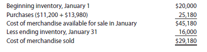 Deducting the cost of the January 31 inventory of $16,000 from the cost of merchandise available for sale of $45,180 yields the cost of merchandise sold of $29,180, as shown below.