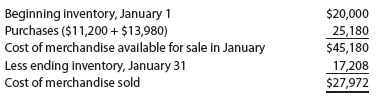 Deducting the cost of the January 31 inventory of $17,208 from the cost of merchandise available for sale of $45,180 yields the cost of merchandise sold of $27,972, as shown below.