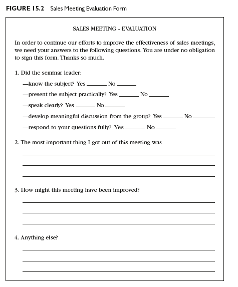 Evaluation. The evaluation phase is often neglected by meeting planners. Yet it is important, especially if management desires to improve meeting effectiveness. The basis for evaluation should be whether the meeting accomplished its aims. To determine this, participant feedback is necessary. Figure 15.2 is a sales meeting evaluation form. This form was designed to evaluate a seminar—other forms are needed to evaluate other types of meetings. The best practice is to design a new form to evaluate each sales meeting held.