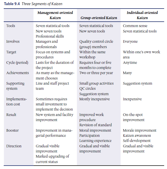 A well planned Kaizen programme can be broken down into three segments—management- oriented Kaizen, group-oriented Kaizen and individual-oriented Kaizen—depending on the complexity and the level of Kaizen. Table 9.4 elaborates and explains this aspect.