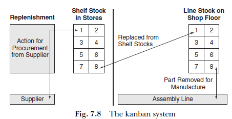 It is basically an information system to support JIT inventory for manufacturing operations. It signals supply of material when used. Kanban, meaning signboard or label, is used as a communication tool in the inventory system. A kanban is attached to every box of parts as they go to the assembly lines. Because these parts are funneled to the line as needed, the kanban can be returned as parts are used to serve both as record of work done and as order for a new lot. Kanban coordinates the inflow of parts and components to the assembly line, minimizing replenishment processing. Kanban is used in process logistics for movement of parts and components on the shop floor of a manufacturing plant (Figure 7.8). The system was first evolved at the Toyota Motor Company in Japan to support the concept and practice ofJIT in the assembly line. The philosophy behind it is “use one, buy one.”