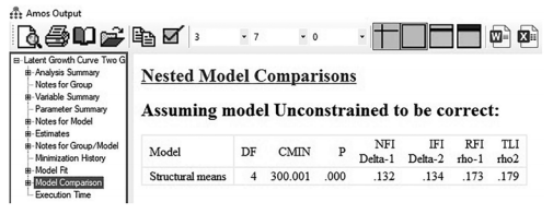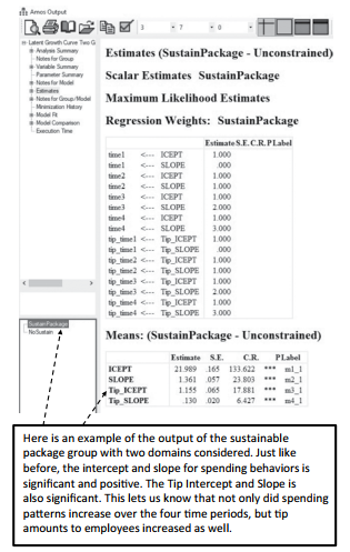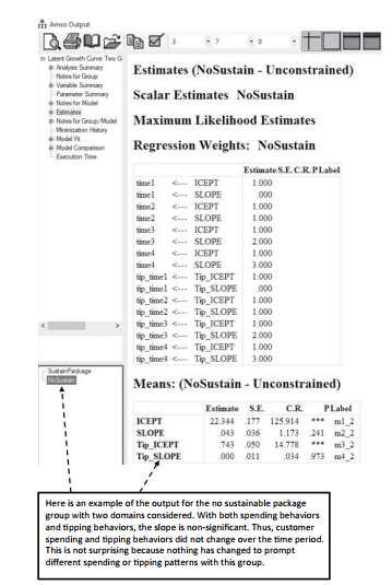 The results of the model comparison test show that constraining those means to be equal across the groups produced a chi-square difference of 300.001, which is significant at a p < .001 level. Hence, we can conclude that the groups are significantly different, and based on the latent growth analysis, spending and tipping patterns significantly increased when sus- tainable packaging was introduced at the golf snack shop.