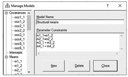 If we wanted to see if the “growth” was significantly different across the groups, we could initially set up a model comparison test where we are going to constrain the intercept and slope for both domains to be equal across the groups and compare it to an unconstrained model.We have labeled the means for all the unobservables as m1–m4 with the “_1” group being the sus- tainable package group and the “_2” group being the no sustainable packaging group.