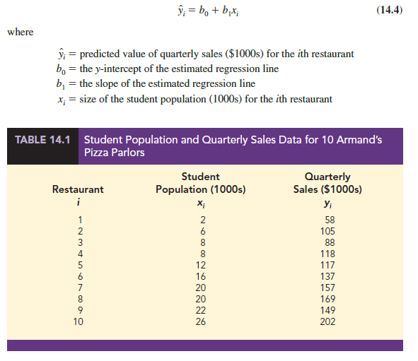 The least squares method is a procedure for using sample data to find the estimated regression equation. To illustrate the least squares method, suppose data were collected from a sample of 10 Armand’s Pizza Parlor restaurants located near college campuses. For the ith observation or restaurant in the sample, xi is the size of the student population (in thousands) and y is the quarterly sales (in thousands of dollars). The values of xi and y for the 10 restaurants in the sample are summarized in Table 14.1. We see that restaurant 1, with x1 = 2 and y1 = 58, is near a campus with 2000 students and has quarterly sales of $58,000. Restaurant 2, with x2 = 6 and y2 = 105, is near a campus with 6000 students and has quarterly sales of $105,000. The largest sales value is for restaurant 10, which is near a campus with 26,000 students and has quarterly sales of $202,000.