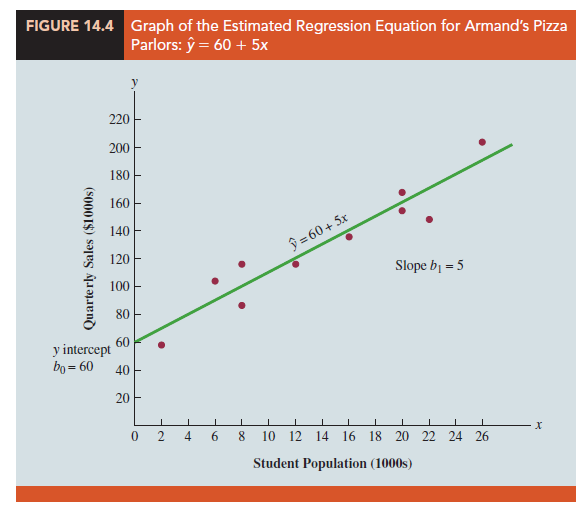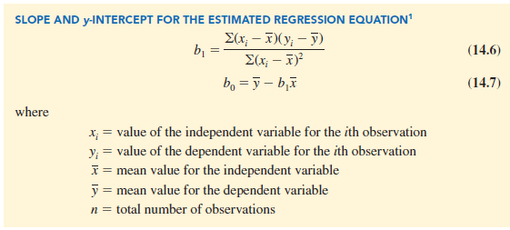 Using equations (14.6) and (14.7) and the information in Table 14.2, we can compute the slope and intercept of the estimated regression equation for Armand’s Pizza Parlors. The calculation of the slope (b1) proceeds as follows.