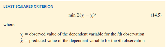 The least squares method uses the sample data to provide the values of b0 and b1 that minimize the sum of the squares of the deviations between the observed values of the dependent variable yi and the predicted values of the dependent variable y. The criterion for the least squares method is given by expression (14.5).