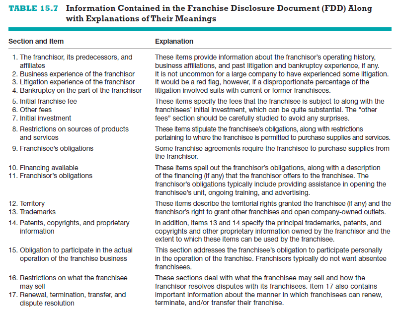 However, the offer and sale of a franchise is regulated at the federal level. Under the Franchise Rule, which is enforced by the Federal Trade Commission (FTC), franchisors must furnish potential franchisees with written disclosures that provide information about the franchisor, the franchised business, and the franchise relationship. The disclosures must be supplied at least 14 busi- ness days before a franchise agreement can be signed or the franchisee pays the franchisor any money.22 In most cases, the disclosures are made through a lengthy document referred to as the Franchise Disclosure Document, which is accepted in all 50 states and parts of Canada. The Franchise Disclosure Document (FDD) contains 23 categories of information that give a prospective franchisee a broad base of information about the background and financial health of the franchisor. A summary of the information contained in the FDD is provided in Table 15.7. A prospective franchisee should fully understand all the information contained in the FDD before a franchise agreement is signed.