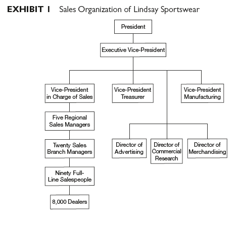 Lindsay Sportswear manufactured a wide line of men’s and boys’ sportswear, including sweaters, hunting coats, caps, gloves, sport coats, slacks, sport shirts, jackets, swimwear, walking shorts, and socks. Annual sales of $125 million attested to the wide consumer acceptance of the “Lindsay Sportswear” brand. The sportswear was distributed directly to 8,000 men’s and boys’ shops and department stores. As Lindsay sales increased over the years, the sales organization evolved from a simple line type into a more complex organization, as shown in Exhibit 1.