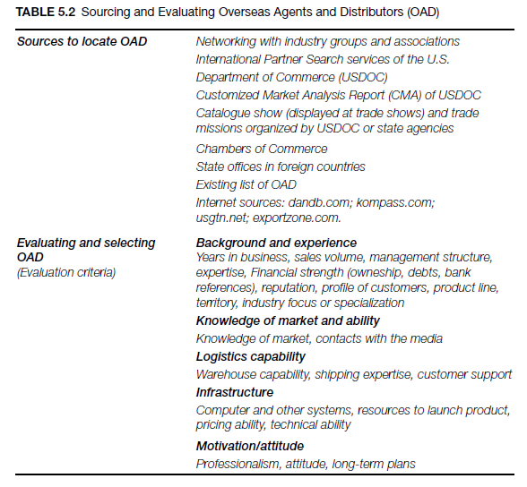 Once the firm has identified markets in which to use agents and distributors, it can locate these intermediaries by using various sources: government trade offices (the Department of Commerce in the United States), chambers of commerce, trade shows, international banks and other firms, trade and professional associations, and advertisements in foreign trade publications. After identifying potential agents and distributors in each desired market, the firm should write directly to each, indicating its interest in appointing a representative and including a brochure describing the firm’s history, resources, product line, personnel, and other pertinent information (Table 5.2).