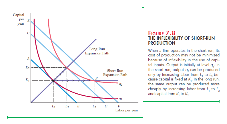 Figure 7.8 shows the firm’s production isoquants. The firm’s long-run expan- sion path is the straight line from the origin that corresponds to the expansion path in Figure 7.6. Now, suppose capital is fixed at a level K1 in the short run. To produce output q1, the firm would minimize costs by choosing labor equal to L1, corresponding to the point of tangency with the isocost line AB. The inflexibility appears when the firm decides to increase its output to q2 without increasing its use of capital. If capital were not fixed, it would produce this output with capital K2 and labor L2. Its cost of production would be reflected by isocost line CD.