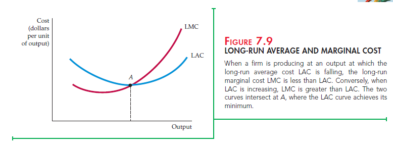 is increased incrementally. LMC lies below the long-run average cost curve when LAC is falling and above it when LAC is rising.10 The two curves intersect at A, where the long-run average cost curve achieves its minimum. In the special case in which LAC is constant, LAC and LMC are equal.