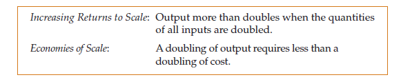 This example illustrates the fact that a firm’s production process can exhibit constant returns to scale, but still have economies of scale as well. Of course, firms can enjoy both increasing returns to scale and economies of scale. It is helpful to compare the two: