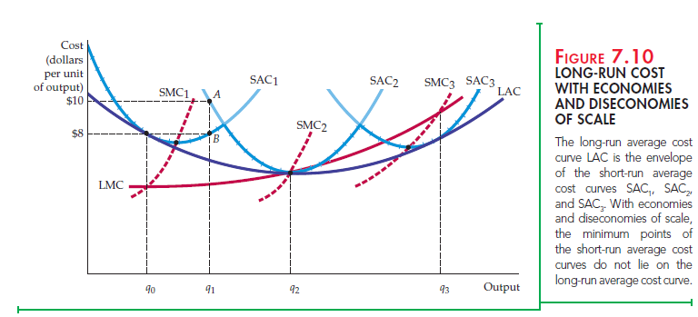 In Figure 7.10, the envelope that would arise if plants of any size could be built is U-shaped. Note, once again, that the LAC curve never lies above any of the short-run average cost curves. Also note that because there are econo- mies and diseconomies of scale in the long run, the points of minimum average cost of the smallest and largest plants do not lie on the long-run average cost curve. For example, a small plant operating at minimum average cost is not effi- cient because a larger plant can take advantage of increasing returns to scale to produce at a lower average cost.
