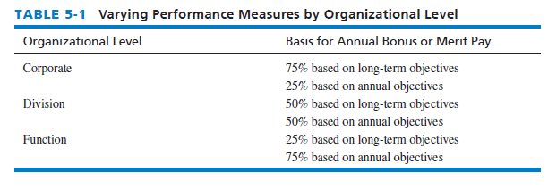 Long-term objectives are needed at the corporate, divisional, and functional levels of an organization. They are an important measure of managerial performance. Many practitioners and academicians attribute a significant part of U.S. industry’s competitive decline to the short-term, rather than long-term, strategy orientation of managers in the United States. Arthur D. Little argues that bonuses or merit pay for managers today must be based to a greater extent on longterm objectives and strategies. An example framework for relating objectives to performance evaluation is provided in Table 5-1. A particular organization could tailor these guidelines to meet its own needs, but incentives should be attached to both long-term and annual objectives.