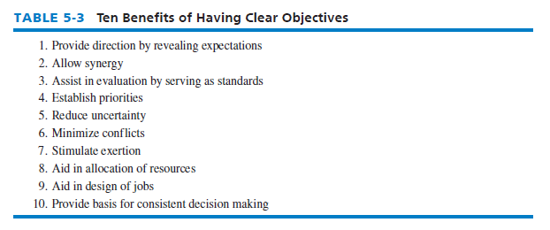 Table 5-2 reveals the desired characteristics of objectives, and Table 5-3 summarizes the benefits of having clear objectives.