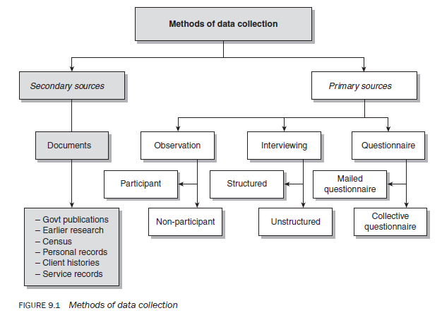 Information gathered using the first approach is said to be collected from primary sources, whereas the sources used in the second approach are called secondary sources. Examples of primary sources include finding out first-hand the attitudes of a community towards health services, ascertaining the health needs of a community, evaluating a social programme, determining the job satisfaction of the employees of an organisation, and ascertaining the quality of service provided by a worker are examples of information collected from primary sources. On the other hand, the use of census data to obtain information on the age—sex structure of a population, the use of hospital records to find out the morbidity and mortality patterns of a community, the use of an organisation’s records to ascertain its activities, and the collection of data from sources such as articles, journals, magazines, books and periodicals to obtain historical and other types of information, are all classified as secondary sources. In summary, primary sources provide first-hand information and secondary sources provide second-hand data. Figure 9.1 shows the various methods of data collection.