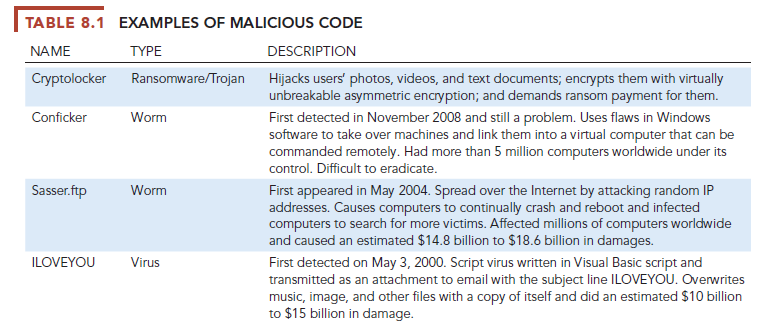 Malicious software programs are referred to as malware and include a variety of threats such as computer viruses, worms, and Trojan horses. (See Table 8.1.) A computer virus is a rogue software program that attaches itself to other software programs or data files to be executed, usually without user knowledge or permission. Most computer viruses deliver a payload. The payload may be relatively benign, such as instructions to display a message or image, or it may be highly destructive-destroying programs or data, clogging computer memory, reformatting a computer’s hard drive, or causing programs to run improperly. Viruses typically spread from computer to computer when humans take an action, such as sending an email attachment or copying an infected file.