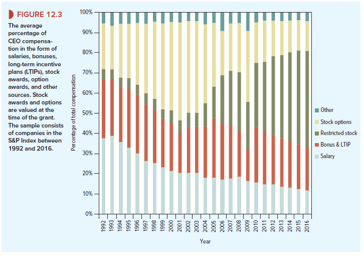 - Figure 12.3 shows that only 12% of compensation for these CEOs comes from salary. The remainder comes from bonuses, stock grants, stock options, and other performance-linked incentives. This proportion of incentive-based compensation has increased sharply and is much higher than in other countries.