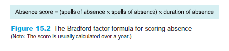 Managing absence is almost impossible without an accurate picture of current absence levels and patterns, which requires identification of areas of high absence and the most common reasons for absence in the organisation. The CIPD (2006) found that 60 per cent of those organisations reporting a reduction in absence said that this was due to improved monitoring. However, such data collection is more often reported in the public sector and manufacturing industry than in the rest of the private sector. The HSE (Silcox 2005a) in a bid to aid employers has produced a new computerised absence recording and management tool, SART, which it hopes will also encourage employers to record such data in a more consistent manner. Prior to its review of absence Carlsberg-Tetley (IDS 2001) did not have an accurate picture of sickness absence. Although some records were kept, absence was inconsistently measured and recorded, so there was no reliable information about level of absence and patterns. This was their first task in tackling absence. They decided to adopt the ‘Bradford factor’ method for scoring absence where both frequency of absence spells and absence duration are used but with the weight being given to the former. The Bradford factor formula, devised by Bradford University, is shown in Figure 15.2. For further information on statistics see IDS (2005).