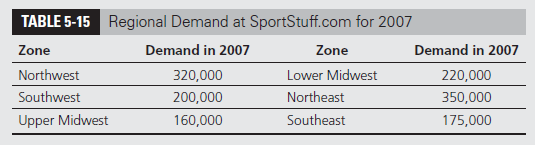 In June 2004, Sanjay leased part of a warehouse in the outskirts of St. Louis to manage the large amount of product being sold. Suppliers sent their product to the warehouse. Customer orders were packed and shipped by UPS from there. As demand grew, SportStuff.com leased more space within the warehouse. By 2007, SportStuff.com leased the entire warehouse and orders were being shipped to customers all over the United States. Management divided the United States into six customer zones for planning purposes. Demand from each customer zone in 2007 was as shown in Table 5-15. Sanjay estimated that the next three years would see a growth rate of about 80 percent per year, after which demand would level off.