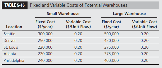 Sanjay and his management team could see that they needed more warehouse space to cope with the anticipated growth. One option was to lease more warehouse space in St. Louis itself. Other options included leasing warehouses all over the country. Leasing a warehouse involved fixed costs based on the size of the warehouse and variable costs that depended on the quantity shipped through the warehouse. Four potential locations for warehouses were identified in Denver, Seattle, Atlanta, and Philadelphia. Leased warehouses could be either small (about 100,000 sq. ft.) or large (200,000 sq. ft.). Small warehouses could handle a flow of up to 2 million units per year, whereas large warehouses could handle a flow of up to 4 million units per year. The current warehouse in St. Louis was small. The fixed and variable costs of small and large warehouses in different locations are shown in Table 5-16.