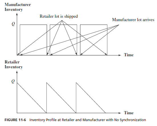 Overall supply chain inventory can be lowered if the manufacturer synchronizes its production to be ready just in time to be shipped to the retailer. In this case, the manufacturer carries no inventory and the retailer carries an average inventory of Q/2. Synchronization of production and replenishment allows the supply chain to lower total cycle inventory from about 3 Q/2 to Q/2.