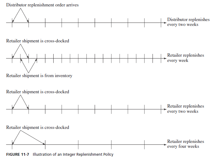 If an integer replenishment policy is synchronized across the two stages, the distributor can cross-dock part of its supply on to the next stage. All shipments to retailers ordering no more frequently than the distributor (every two or four weeks) are cross-docked, as shown in Figure 11-7. For retailers ordering more frequently (every week) than the distributor, half the orders are cross-docked, with the other half shipped from inventory, as shown in Figure 11-7.