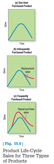 as an engagement ring or retirement home), infrequently, or often. For one-time products, sales rise at the beginning, peak, and approach zero as the number of potential buyers becomes exhausted [see Figure 15.6(a)]. If new buyers keep entering the market, the curve will not go to zero.