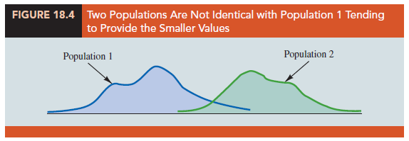 The alternative hypothesis that the two populations are not identical requires some clarification. If H0 is rejected, we are using the test to conclude that the populations are not identical and that population 1 tends to provide either smaller or larger values than population 2. A situation where population 1 tends to provide smaller values than population 2 is shown in Figure 18.4. Note that it is not necessary that all values from population 1 be less than all values from population 2. However, the figure correctly shows, the conclusion that Ha is true; the two populations are not identical and population 1 tends to provide smaller values than population 2. In a two-tailed test, we consider the alternative hypothesis that either population may provide the smaller or larger values. One-tailed versions of the test can be formulated with the alternative hypothesis that population 1 provides either the smaller or the larger values compared to population 2.