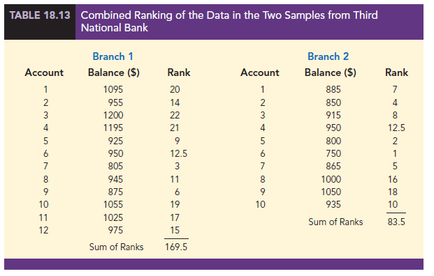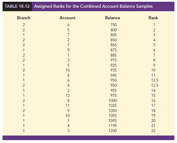 As before, the first step in the MWW test is to rank the combined data from the lowest to highest values. Using the combined 22 observations in Table 18.11, we find the smallest value of $750 (Branch 2 Account 6) and assign it a rank of 1. The second smallest value of $800 (Branch 2 Account 5) is assigned a rank of 2. The third smallest value of $805 (Branch 1 Account 7) is assigned a rank of 3, and so on. In ranking the combined data, we may find that two or more values are the same. In that case, the tied values are assigned the average rank of their positions in the combined data set. For example, the balance of $950 occurs for both Branch 1 Account 6 and Branch 2 Account 4. In the combined data set, the two values of $950 are in positions 12 and 13 when the combined data are ranked from low to high. As a result, these two accounts are assigned the average rank (12 + 13)/2 = 12.5. Table 18.12 shows the assigned ranks for the combined samples.