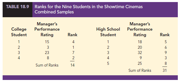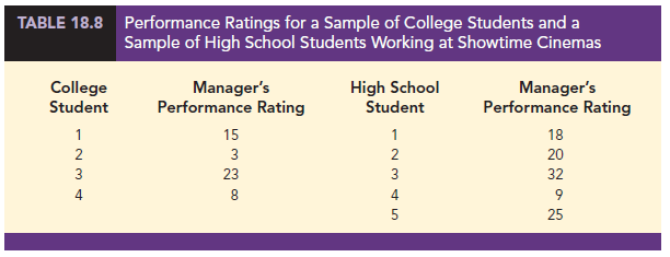 We begin by selecting a random sample of four college students and a random sample of five high school students working at Showtime Cinemas. The theater manager’s overall performance rating based on all 35 employees was recorded for each of these employees, as shown in Table 18.8. The first college student selected was rated 15th in the manager’s annual performance report, the second college student selected was rated 3rd in the manager’s annual performance report, and so on.