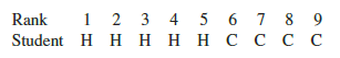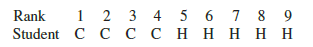Let us consider why the sum of the ranks will help us select between the two hypotheses: H0: The two populations are identical and Ha: The two populations are not identical. Letting C denote a college student and H denote a high school student, suppose the ranks of the nine students had the following order with the four college students having the four lowest ranks.