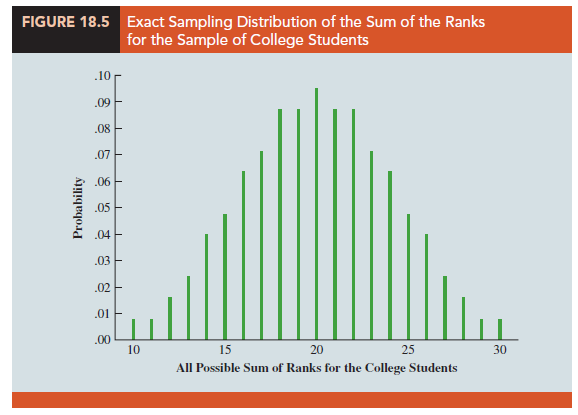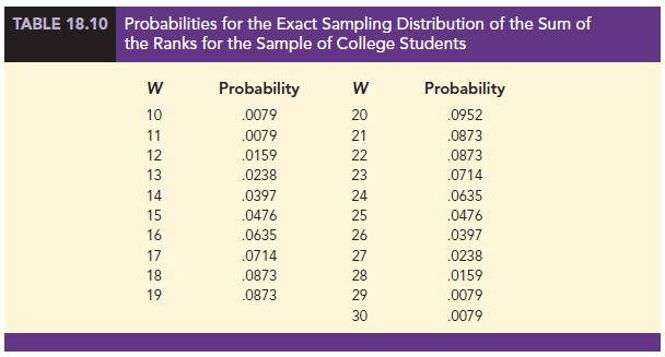 Making the assumption that the two populations are identical, we used a computer program to compute all possible orderings for the nine students. For each ordering, we computed the sum of the ranks for the college students. This provided the probability distribution showing the exact sampling distribution of W in Figure 18.5. The exact probabilities associated with the values of W are summarized in Table 18.10. While we will not ask you to generate this exact sampling distribution, we will use it to test the hypothesis that the two populations of students are identical.