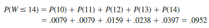 Let us use the sampling distribution of W in Figure 18.5 to compute the p-value for the test just as we have done using other sampling distributions. Table 18.9 shows that the sum of ranks for the four college student is W = 14. Because this value of W is in the lower tail of the sampling distribution, we begin by computing the lower tail probability P(W < 14). Thus, we have