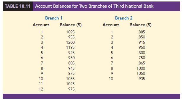 We illustrate the use of the normal distribution approximation for the MWW test by considering the situation at Third National Bank. The bank manager is monitoring the balances maintained in checking accounts at two branch banks and is wondering if the populations of account balances at the two branch banks are identical. Two independent samples of checking accounts are taken with sample sizes n1 = 12 at branch 1 and n2 = 10 at branch 2. The data are shown in Table 18.11.