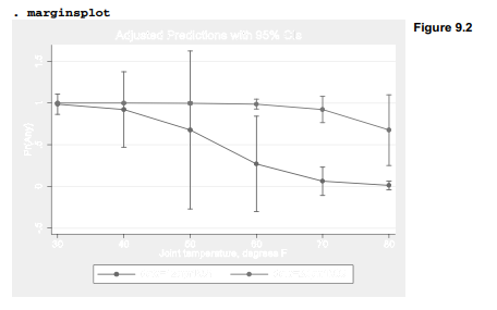 The default marginsplot graph in Figure 9.2 conveys basic information, but is not pretty. For a more publishable version we could suppress the confidence intervals (noci), relocate the legend, use plot#opts() to visually distinguish the two curves, and add a title. First, we run margins again with one-degree increments in temperature, which will make the resulting curves smoother.