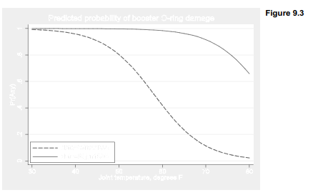 According to our logistic model, around the time of the earliest shuttle flight (dashed curve in Figure 9.3) the probability of thermal distress goes from near zero at 80 °F, to near one below 40 °F. By the time ofthe Challenger flight (solid curve), however, the probability of any distress exceeds .6 even in warm weather, and climbs toward one on flights below 70 °F. Note that Challenger’s actual temperature at launch, 31 °F, would place it at top left in Figure 9.3.